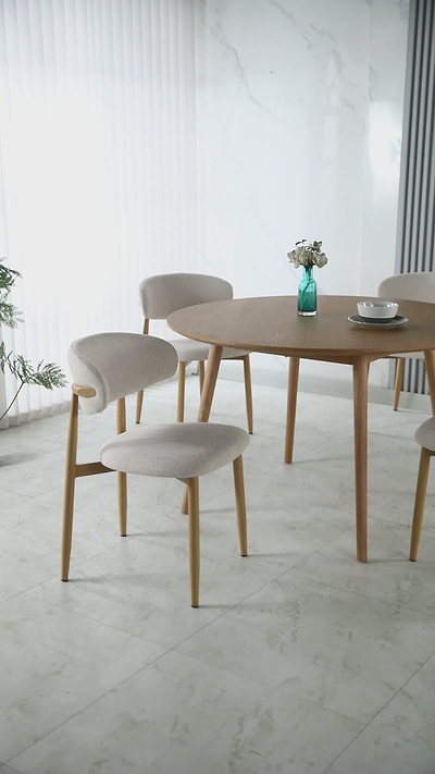 פינת אוכל שולחן עגול צבע עץ אלון קוטר 120 ס"מ דגם דניאל+4 כיסאות חול בשילוב רגל אלון דגם celio